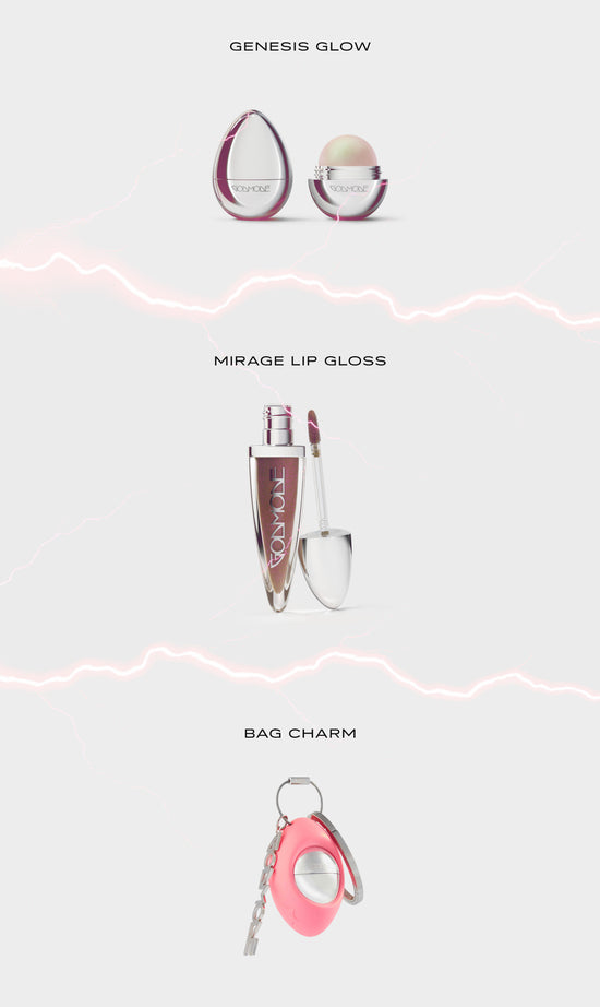 Sealing the bundle is a rare, collectible Bag Charm—an artifact from the Godmode archives, whispered about as a luminous relic that houses Genesis Glow so you can bring your glow-to-go. Together, they let you Gloss, Glow, and Go—turning every look molten magic.
